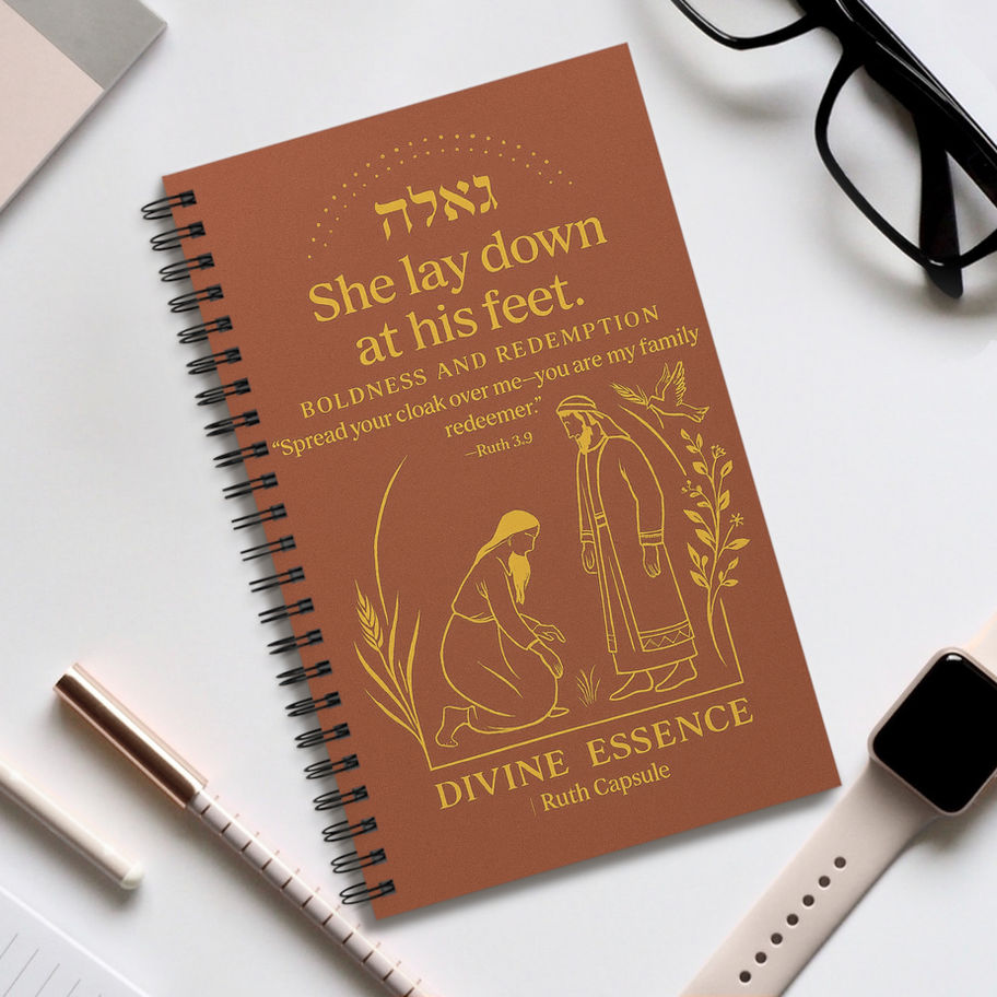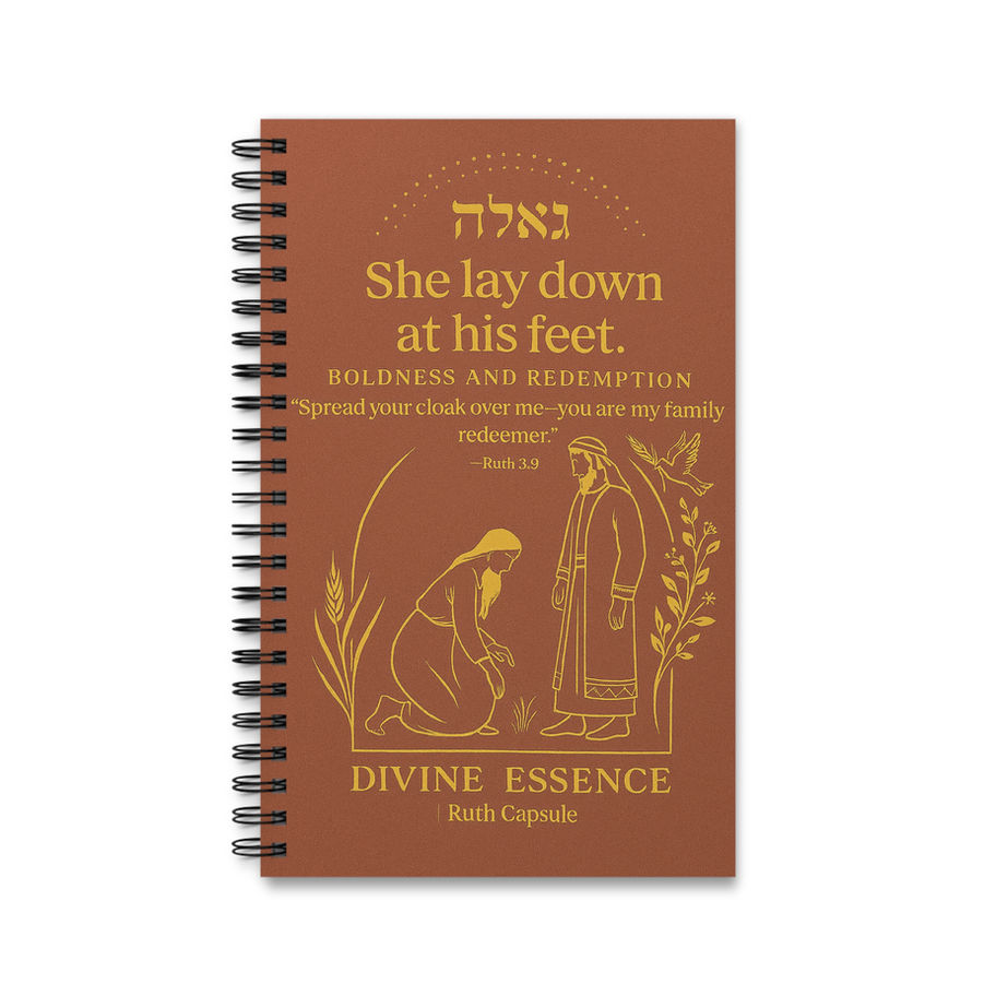 This spiral journal carries a quiet, reverent energy—warm terracotta cover, gold-foil-inspired artwork and a simple scene drawn from the story of Ruth. Short, lined pages invite prayers, reflections, sermon notes or everyday gratitude. The spiral binding lies flat for easy writing and the semi-gloss laminated cover resists wear while keeping the color rich. Use it at home, in study groups, or tucked into a bag for moments of journaling between errands or after worship. The tone of the design leans into themes of devotion, courage, and belonging—an intimate place to record thoughts on faith, passages that move you, or small acts of hope.
